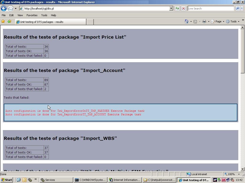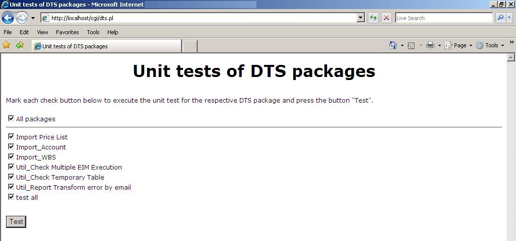 After defining the tests conditions and writing them using the module Test::More, I created a web application using CGI::Application and a modified version of Test::Harness to be able to execute tests without forking a new process. This allows the application to execute tests concurrent in different DTS packages and generating a HTML result of the tests.
