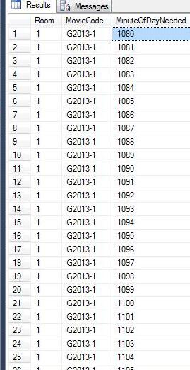CREATE VIEW RoomsUsage WITH SCHEMABINDING AS SELECT s.Room , m.MovieCode , MinuteOfDayNeeded = ( ( s.StartHour * 60 ) + s.StartMinute + n.Number - 1 ) % ( 60 * 24 ) -- A movie might last over midnight FROM dbo.MovieShows s INNER JOIN dbo.Movies m ON m.MovieCode = s.MovieCode INNER JOIN dbo.Numbers n ON n.Number BETWEEN 1 AND m.DurationInMinutes GO SELECT * FROM RoomsUsage GO