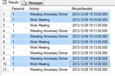 CREATE VIEW ScheduleTimeUsage WITH SCHEMABINDING AS SELECT s.PersonId , s.Activity , MinuteNeeded = DATEADD(MINUTE, n.Number - 1, s.StartDate) FROM dbo.Schedule s INNER JOIN dbo.Numbers n ON n.Number BETWEEN 1 AND DATEDIFF(MINUTE, s.StartDate, s.EndDate)&bsp; GO SELECT * FROM ScheduleTimeUsage ORDER BY PersonId , MinuteNeeded GO