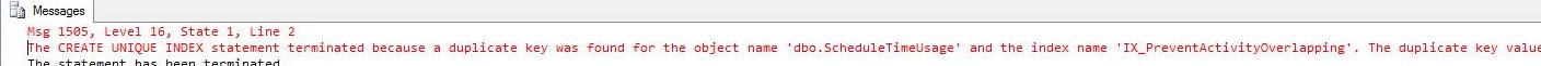 DELETE Schedule WHERE PersonId = 1 AND Activity LIKE '%meeting%' CREATE UNIQUE CLUSTERED INDEX IX_PreventActivityOverlapping ON ScheduleTimeUsage(PersonId,MinuteNeeded)