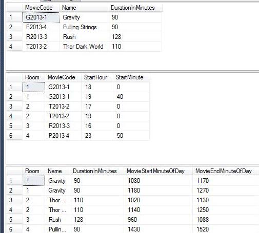 SELECT * FROM Movies SELECT * FROM MovieShows SELECT s.Room , m.Name , m.DurationInMinutes , MovieStartMinuteOfDay = ( s.StartHour * 60 ) + s.StartMinute , MovieEndMinuteOfDay = ( ( s.StartHour * 60 ) + s.StartMinute + m.DurationInMinutes ) FROM MovieShows s INNER JOIN Movies m ON m.MovieCode = s.MovieCode GO