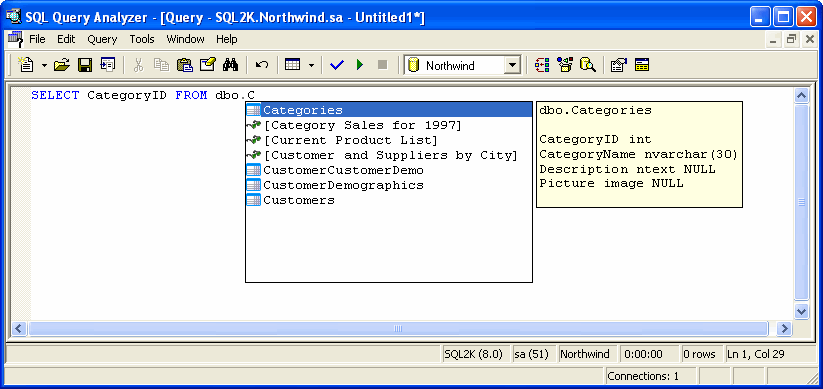 Server Query Analyzer. Note that it not only provides a list of matching objects