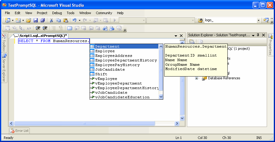 used for a database project), PromptSQL will bring up Intellisense prompts