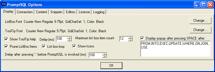 Intellisense, how the lists are formated (font size and type), whether or not to use owners/schema, etc.