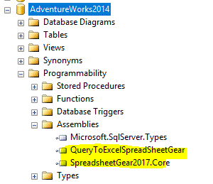 }In the solution, there are several T-SQL scripts. The SQLCLR framework allow us to define only one T-SQL as pre-deployed. It means to be executed before the assembly is published. Similarly, there is a post-deploy script that is executed after the assembly is published. In the pre-deployed script, named PreDeployment.sql, I first create the EXCEL schema, then I create an asymmetric key based on the solution snk file. Then I create a login and grant the unsafe assembly permission to that login. In the post deployment script, I transfer the resulting stored procedure from the default DBO schema to newly created EXCEL schema. To test installation, expand Programmability->Assembly node and make sure you have both assemblies there (as shown in the image below).