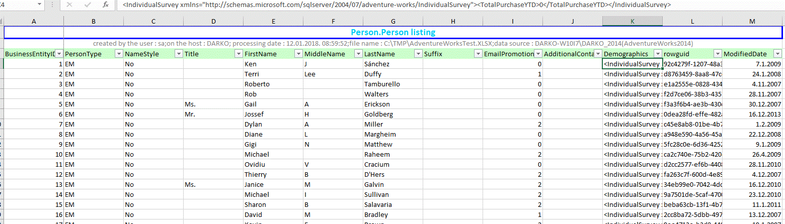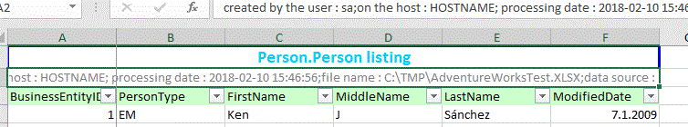 EXEC [Excel].[QueryToExcelSSG] 'SELECT BusinessEntityID , PersonType , FirstName , MiddleName , LastName , ModifiedDate FROM PERSON.PERSON; ' , NULL , 'C:\TMP\AdventureWorksTest.XLSX' , 'Person.Person listing' , 'Person';