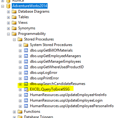 Then you check Programmability->Stored Procedures and make sure that the stored procedure, EXCEL.QueryToExcelSSG, is there, as shown in the image below.