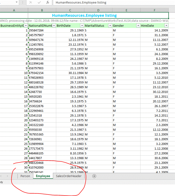 We could specify multiple queries. Each query should be separated with a semicolon. In addition, we could provide sheets name separated by semicolon, as well as titles. In the example bellow we combine three T-SQL queries. The result of the first query is the table 'Person.Person'. The second query will return the table 'HumenResource.Employee', and the third query will return the table 'Sales.SalesOrderHeader'.
