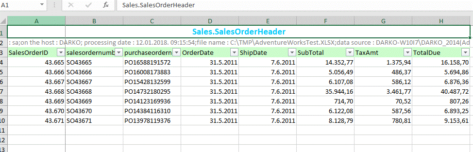EXEC [Excel].[QueryToExcelSSG] 'SELECT SalesOrderID , salesordernumber , purchaseordernumber , OrderDate , ShipDate , SubTotal , TaxAmt , TotalDue FROM Sales.SalesOrderHeader WHERE SalesOrderId >= @salesId1 AND SalesOrderId <= @salesId2; ', '@salesId1 int=43665,@salesId2 int=43671', 'C:\TMP\AdventureWorksTest.XLSX', 'Sales.SalesOrderHeader', 'SalesOrderHeader';