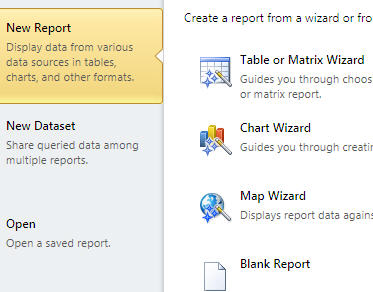 Report Builder, by contrast, doesn't pretend to be any better than it is - a standalone application for creating reports. Here's what you see when you start Report Builder: