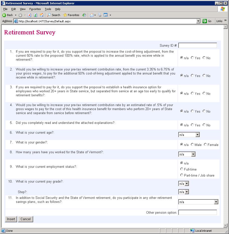 Once the kinks are worked out and some additional data validation is added to the input form the data entry works. Using reporting services I can quickly create a report to show the results as they are entered in real-time. With a few additions to the report I have added some pie charts. The question numbers, the text of the questions, the possible answers and the number of responses are presented in the Reporting Service Report. All of which are pulled from the database tables. Things are looking good, so I think. The data entry operators and Director like the input form and things are going smoothly. Duplicate numbers are caught, and the integrity of a single user response is validated. The survey results start pouring in: 2500 results which are about 30%. Not bad for a mailed survey.