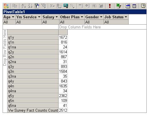 I was able to use Reporting Services to create reports based on the cube and show results based on each dimension. However, with out a third party application interface available for slicing and dicing the OLAP cube I publish an html version of Excel pivot table with interactive cube functionality to our intranet. Now the front office could really analyze the data and slice and dice across results and demographics. This information provides more insight into the response rather than just a summarized tally of the overall results.