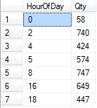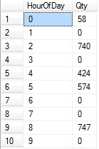 Now that we have the test data I will sum the data for one day by hour using a table variable. A table variable is like a temp table, but you have to declare it first and it will only exist during the current session. The reason for the table variable is so I can create a basic table with all the hours of the day. This table will just be populated for one day with a start hour and a next hour. I will then left join the #SalesTestDate table to this table. I use a left join so when I use the SUM and GROUP BY hour I will get a 0 for those hours without a sale.