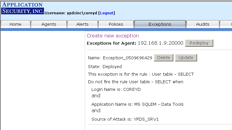 - Exceptions: Act as a filter for policy rules. Instead of turning off a particular rule, users can choose to configure an exception that stops the firing of an alert if certain conditions occur. For example, if you configured AppRadar to check for rule "Database Stopped" on a particular database's Agent, you might want to create an exception if the database user is "sa". Then if that database is stopped, the Agent will only fire the alert if the database user is not "sa" since it does not satisfy the exception.