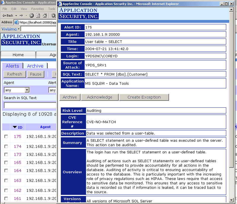 AppRadar™ provides detection/prevention at the application layer (not just the transport/network layers), whether the attack is from a valid user or intruder, and provides a reliable method of monitoring and preventing attacks for enterprise databases even if the attack is embedded deeply within a SQL command. The "intelligent database security sensor" works alongside existing operating system and network operating system security sensors. AppRadar™ also facilitates information security lockdown policies to ensure more efficient use of enterprise IT resources, and it provides a centralized management of database audit events on attack information that empowers organizations to manage large amounts of database attack, audit, and system events. AppRadar™ is host-based and can send alerts to either your existing monitoring infrastructure or to Application Security, Inc.'s own Enterprise Management Console. AppRadar™ meets Common Vulnerabilities and Exposures (CVE) requirements (http://www.cve.mitre.org/compatible/organizations.html#appsecinc), and it provides a continuously updated database security knowledge base via ASAP updates which are backed by Application Security, Inc.'s own research and development team (SHATTER).