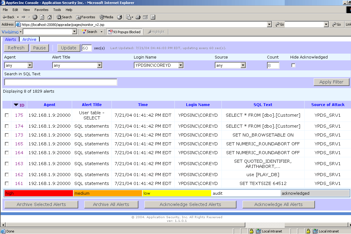 The AppSecInc Console for monitoring security alerts provides the following features:
