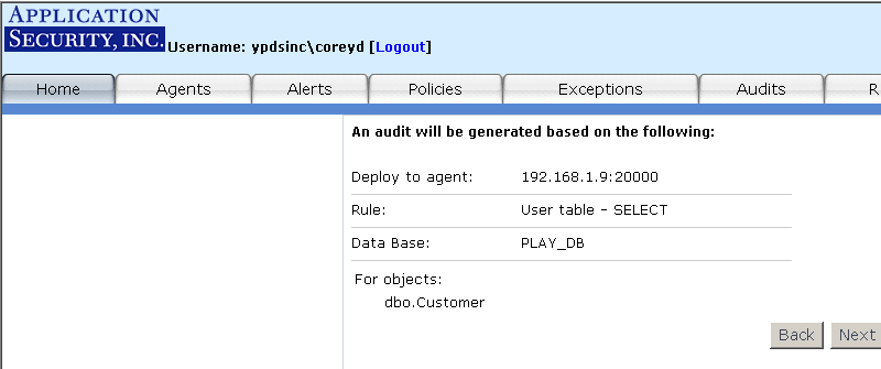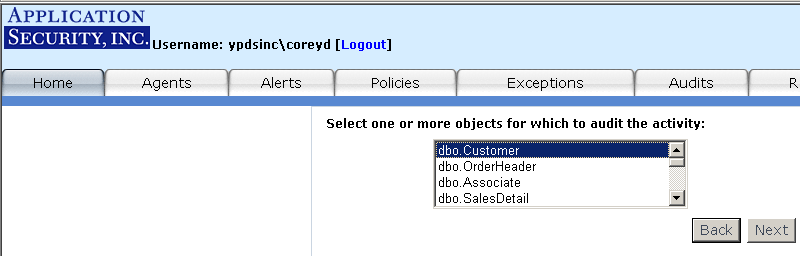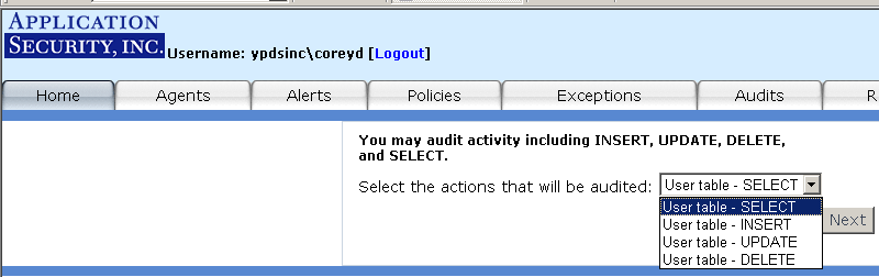 - Auditing: A feature that allows you to specify your audit policy rules in much greater detail. For example, you may wish only to monitor SQL SELECT statements that execute against the customers table in the Northwind database. AppRadar allows you to define a "SELECT from User Table" audit for that table. Once the audit is deployed to the Agent, AppRadar will only fire alerts for the "SELECT from User Table" rule if a SQL SELECT statement is executed against that specific database table.
