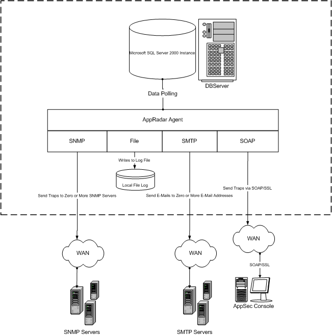 - AppRadar™ Alerts: Alerts/notifications are sent out when a Sensor detects a database event. Delivered through a number of different methods (i.e. E-mail, SNMP, log files, Third-Party Management Consoles, AppSecInc Console, etc.).