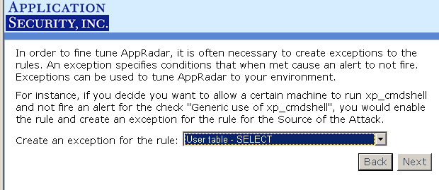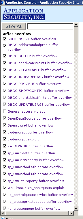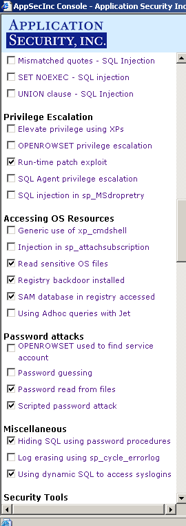 A complete listing of all the database attack rules and categories included within AppRadar™ can be found on the Application Security, Inc. website at: