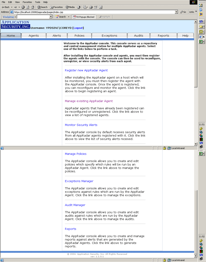 - AppSecInc Console - Web-based application used to manage and receive alerts from the AppRadar Agents. Install the AppSecInc Console on a machine that is connected to the network continuously if you want to receive alerts sent by the Agent around the clock. For strictly managing AppRadar Agents, you can install on an administrator's workstation that is not running constantly..