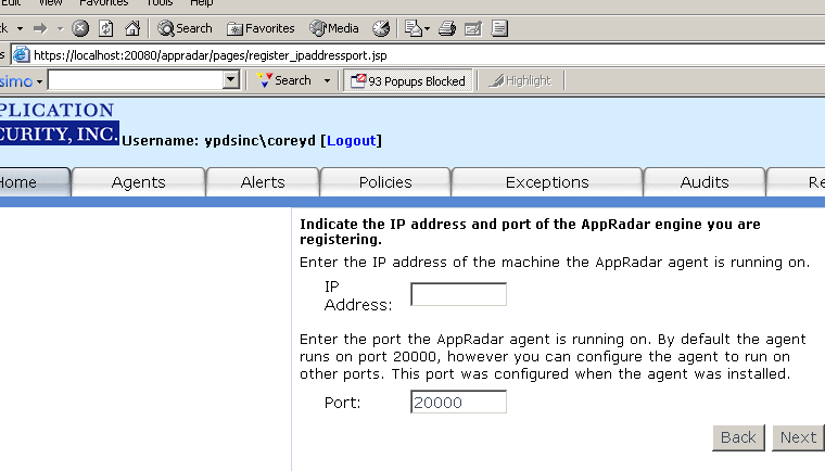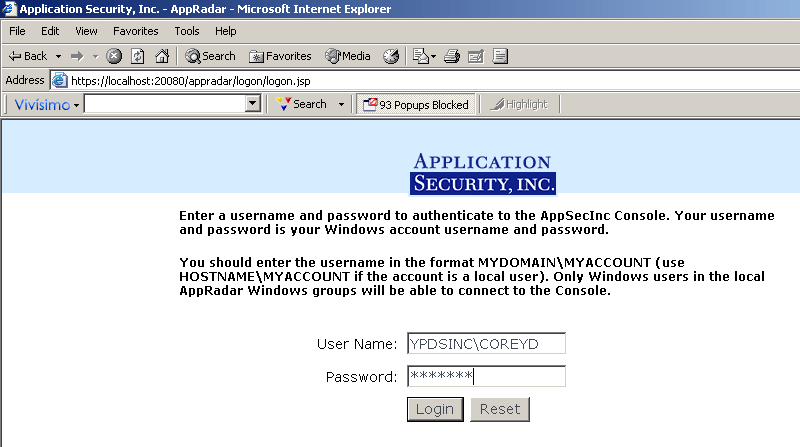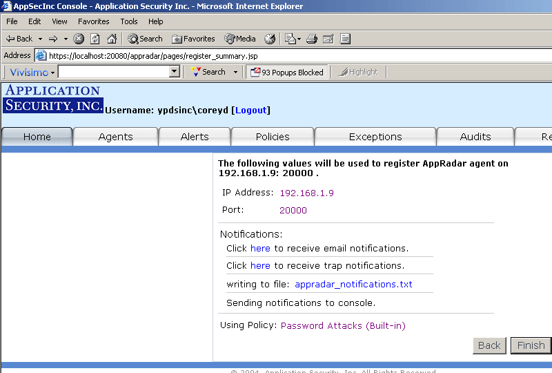 Upon completion of the installation, you will be asked if you want to launch the AppSecInc Console. If you don't want to launch it at that time, you can access it by starting your Web browser and connecting to https://YourMachineName:InstallPort (i.e. https://localhost:20080).
