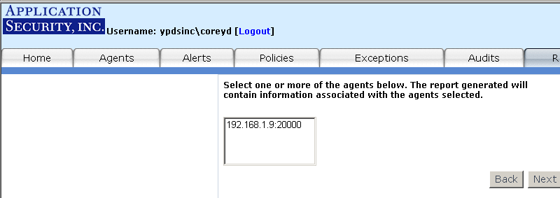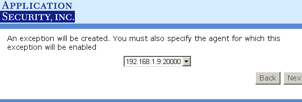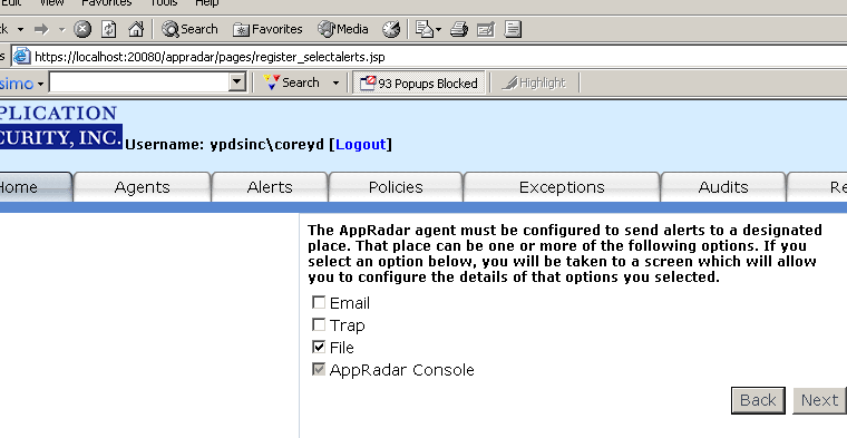 You will then be asked where you want the alert sent (Figure 5). AppConsole is greyed out because, by default, all Registered Agents must send alerts to AppSecInc Console (non-configurable). If you checked the "File" option, alerts will be written to a file named