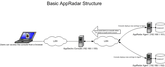 - AppSecInc Console: A web-based application accessible via a web browser. Installed on a shared, network-accessible host that configures/monitors AppRadar™ Sensor activity. Events (configuration and security alert data) reported by the Sensors are archived or saved for presentation via the Console. A single AppSecInc Console can monitor thousands of databases (scalable architecture).