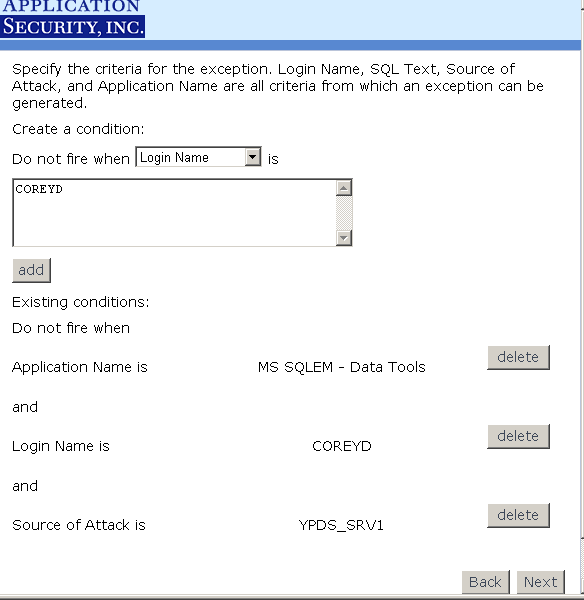 - The Exceptions screen lacks clear instructions for setting up the conditions (need to demonstrate an example), and it needs to allow you to choose Windows user accounts by using Active Directory Services Interface (ADSI) scripts so you don't have to know the exact username. It also needs to allow you select multiple user names/conditions in one statement.