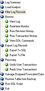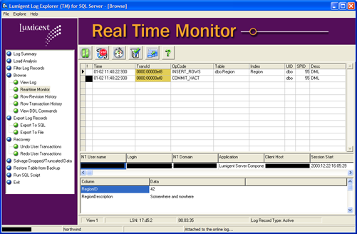 The installation of Log Explorer comes with a very easy to use hands-on tutorial that explains much, but not quite all, of the functionality in the product. However, the first thing I did after I installed the product was to start it without going through the tutorial or reading any manual. This way I have a chance to get a feel for the intuitiveness of the product. And besides, let’s face it, who reads a manual if they don't have to? After I specified which server I wanted to connect to I got to choose which database to attach a log file for. I could either choose the online log or a log backup. I didn't know it at that moment, but Log Explorer is actually capable of attaching more than one log file, either several backup files or a mix of backup files and the online log. You can then apply all the functionality of Log Explorer to the combined single virtual log. When you have attached Log Explorer to a log file you are ready to start exploring. The GUI is clear, it is mainly grids and menus except for some unnecessarily big purple borders. As you can see in the image to the right the menu items are very self-explanatory. Still, I would probably have felt more at home in a standard Windows GUI, maybe even an MMC snap-in. Nevertheless, I can't really complain, as it took me only a second to start viewing what was happening right then in my online log. Just a single click on 'Real-time Monitor', and then an INSERT statement in Query Analyzer, and I could immediately see the transaction in Log Explorer: Viewing the log in realtime (click for larger image) | ![]() The main menu of Log Explorer |