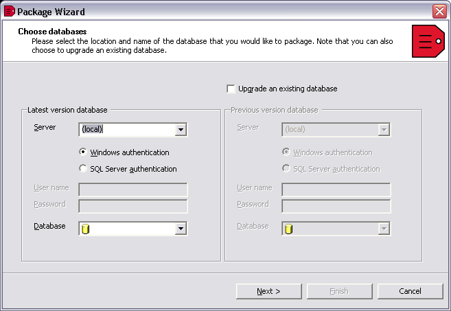 (If you are upgrading a database, the steps will be almost identical. The main difference being that you will select a second database at the “Package Wizard” startup screen that is of a previous version. SQL Packager runs a comparison and generates a set of differences which you can select from, including data.)
