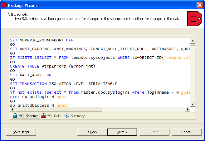 Once the processing is finished you are given the opportunity to review and save the TSQL generated for the schema and data scripts. Should you run into any problems with the installation process you can utilize these scripts to pinpoint the issue. Another nice feature is the summary tab, which provides you with the steps that will be taken in reconstructing your database during the installation.