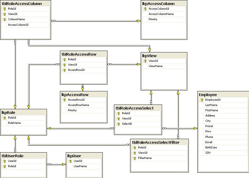 The key security table tblRoleAccessSelect points to those records in the gateway table Employee that may be seen by any given role and view.
