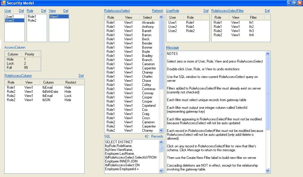 In this example there are two Users, two Roles, and one View. The Employee table has 100 randomly generated records.