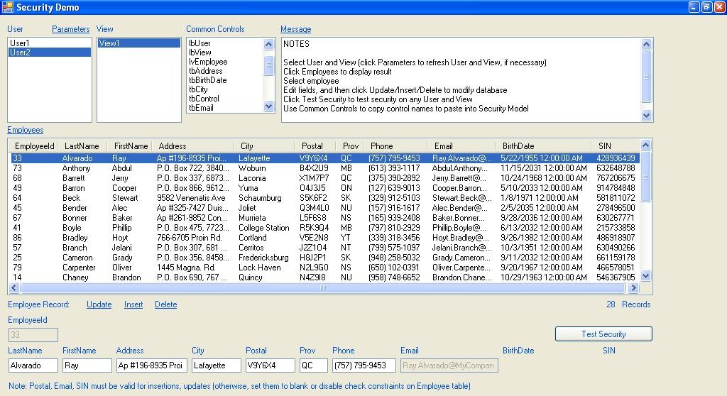 After selecting an Employee, clicking the Test Security button will lock the Email control and hide the BirthDate and SIN controls (locking has greater priority than hiding, although this priority can be changed in the tblRoleAccessColumn table).
