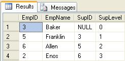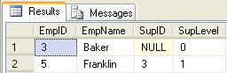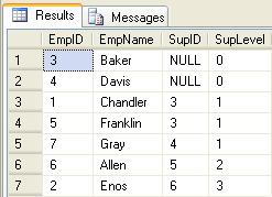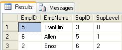 In an upstream select, if we only wanted to know the immediate Supervisor of an Employee we would set @maxSupLevel = 1. The preceding example would show only the selected Employee Enos, and the immediate Supervisor Allen: