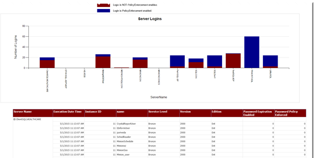 Another example of this transparency is the Password Policy Enforcement report, which gives a breakdown per server of the count and names of logins, and their password enforcement status: