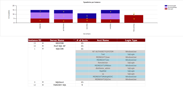 The details table at the bottom of the report breaks out all of the specific accounts that are members of the sysadmin security group, on each instance. “Login Type” refers to the method by which the account obtained sysadmin rights. For example, “RemoteUser” is granted sysadmin privileges directly, as a SQL login.