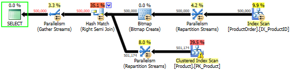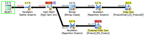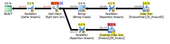 Now Product table contains 1,000,000 rows and half of them are in ProductOrder table. So, each second Product was ordered. This means each our test query should return 500,000 rows. Once we have the tables set up, we can test our options and take a look at the execution plans of each of them.