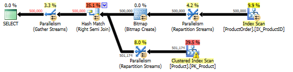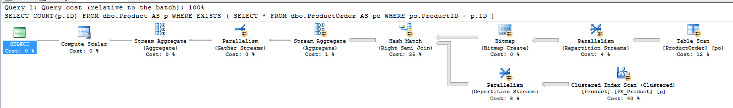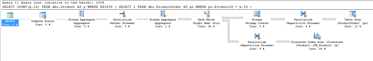 In the picture 1 below you can see that SQL Server using indexes built on top of Product and ProductOrder tables applies the "Right Semi Join" operator to implement the EXISTS logical operator. The "Right Semi Join" guarantees that the only rows from the Product table that have a match in the ProductOrder table are returned.