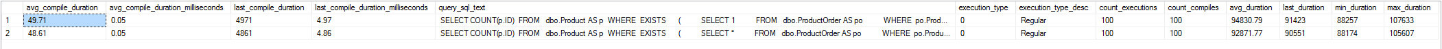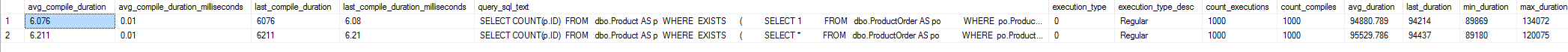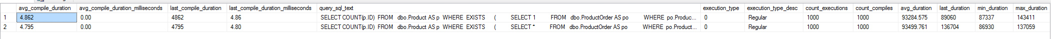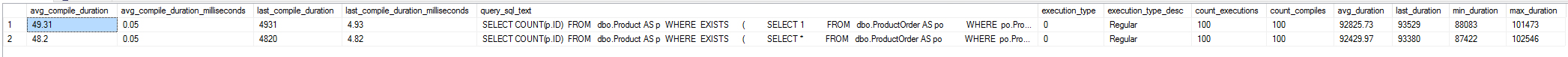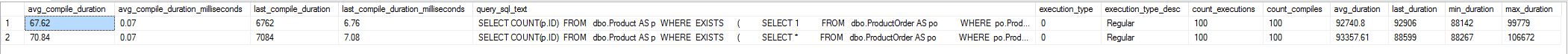 It worth noting that I ran ostress many times and I saw different results. Here I am going to show you some of them to give you a clearer picture. Actually, I do not understand why avg_compile_duration always equals last_compile_duration while count_compiles is 100. Also, I am not sure what the measurement unit for avg_compile_duration is. I saw there were numbers like 5.123, 5123, and 51.123. That's why you can see "avg_compile_duration / 100 AS avg_compile_duration_milliseconds" in my script. But again, as last_compile_duration always matches to avg_compile_duration I would think that last_compile_duration reported in microseconds. Because 6,78 is very close to the numbers we had above from STATISTICS TIME ON output.