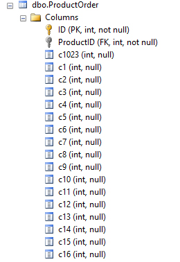 For now we have seen that there is no difference in performance between #1 and #3. But, I do not what to give up. Actually, I heard and read many times that case #1 forces SQL Server to expand metadata that, in turn, can lead to a slower compilation. But, how can we check it? Hmm. Let's add 1022 fields to the ProductOrder table. I think the max value of fields must show us at least something interesting about that assumption.