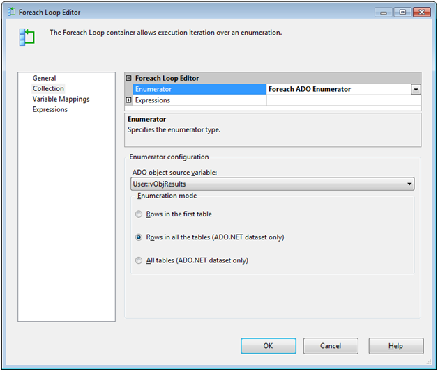 Collection Page: The ForEachLoop task provides various Enumerator methods to loop through a result set. To loop through our obtained result sets, we set the enumerator to the ADO Enumerator. Assign the source of the enumerator to the object variable vObjResults and the mode to Rows in all Tables.