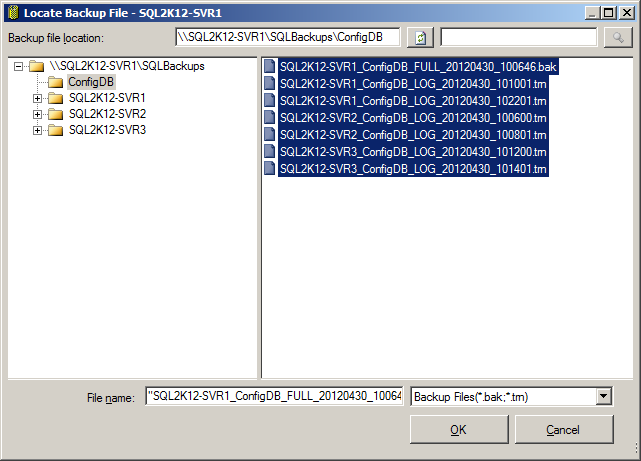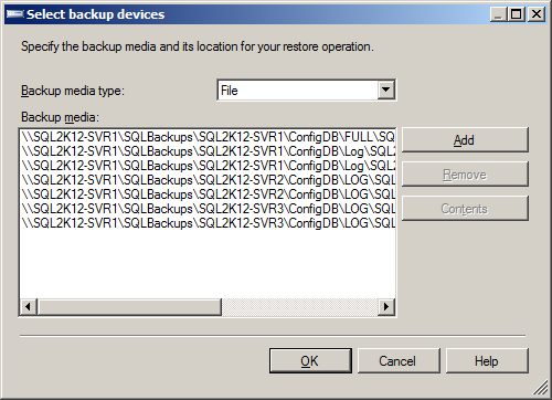 USE [master] BACKUP LOG [ConfigDB] TO DISK = N'\\SQL2K12-SVR1\SQLBackups\ConfigDB_LogBackup_2012-04-30_11-06-03.bak' WITH NOFORMAT, NOINIT, NAME = N'ConfigDB_LogBackup_2012-04-30_11-06-03', NOSKIP, NOREWIND, NOUNLOAD, STATS = 5 RESTORE DATABASE [ConfigDB] FROM DISK = N'\\SQL2K12-SVR1\SQLBackups\ConfigDB\SQL2K12-SVR1_ConfigDB_FULL_20120430_100646.bak' WITH FILE = 1, NORECOVERY, NOUNLOAD, STATS = 5 RESTORE LOG [ConfigDB] FROM DISK = N'\\SQL2K12-SVR1\SQLBackups\ConfigDB\SQL2K12-SVR2_ConfigDB_LOG_20120430_100801.trn' WITH FILE = 1, NORECOVERY, NOUNLOAD, STATS = 5 RESTORE LOG [ConfigDB] FROM DISK = N'\\SQL2K12-SVR1\SQLBackups\ConfigDB\SQL2K12-SVR1_ConfigDB_LOG_20120430_101001.trn' WITH FILE = 1, NORECOVERY, NOUNLOAD, STATS = 5 RESTORE LOG [ConfigDB] FROM DISK = N'\\SQL2K12-SVR1\SQLBackups\ConfigDB\SQL2K12-SVR3_ConfigDB_LOG_20120430_101200.trn' WITH FILE = 1, NORECOVERY, NOUNLOAD, STATS = 5 RESTORE LOG [ConfigDB] FROM DISK = N'\\SQL2K12-SVR1\SQLBackups\ConfigDB\SQL2K12-SVR3_ConfigDB_LOG_20120430_101401.trn' WITH FILE = 1, NORECOVERY, NOUNLOAD, STATS = 5 RESTORE LOG [ConfigDB] FROM DISK = N'\\SQL2K12-SVR1\SQLBackups\ConfigDB\SQL2K12-SVR1_ConfigDB_LOG_20120430_102201.trn' WITH FILE = 1, NOUNLOAD, STATS = 5 GO