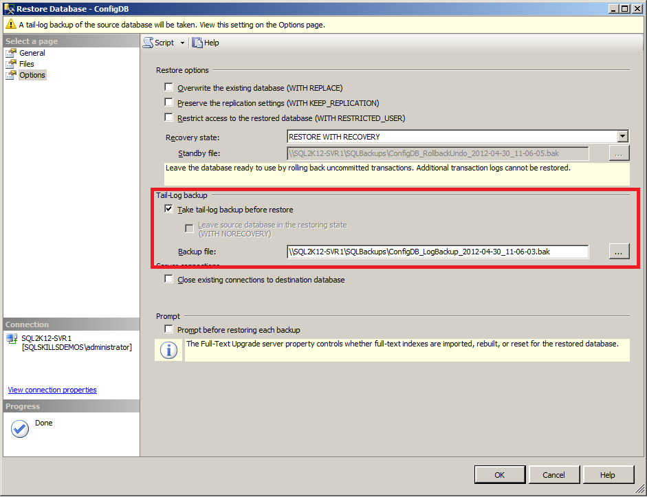 The Options page shows the tail-log backup location, which is the default backup location for the current server, and a filename that is a concatenation of the database name, the term LogBackup, and a date and time stamp.
