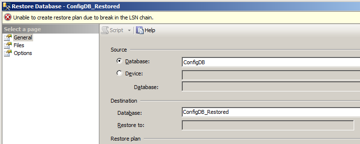 When working with a database that is in an AG, with backups taken across different AG nodes, there will be a break in the log sequence numbers stored in the msdb backup history for the current node. In such a case, the DRA will display an error to the effect that it cannot use the msdb backup history data to create the restore plan.