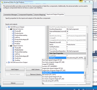 Once in there, go to the Input and Output Properties and select the Output Columns. The ProductName, ProductAlternateKey, Color and Size have to be changed from Unicode string (DT_WSTR) to string (DT_STR) as seen in Figures 10 and 11.