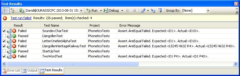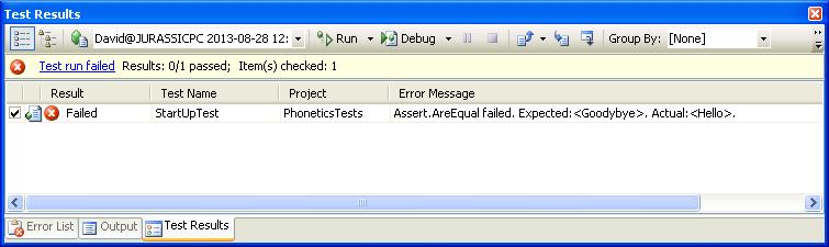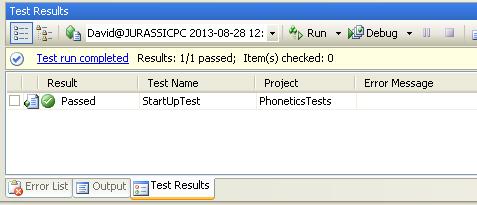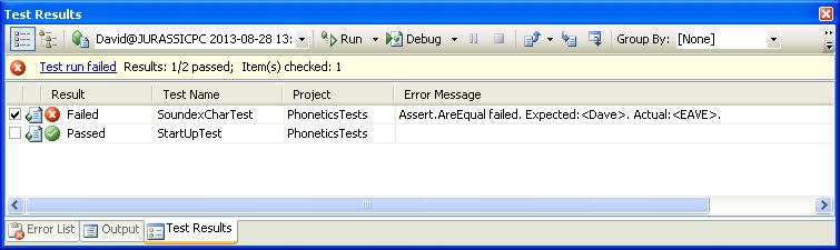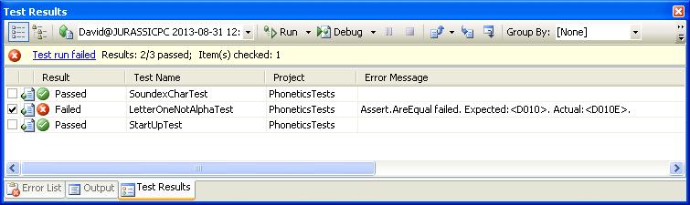 Thinking about SoundexLong then if I pass in a single alphabetic character then I should get the same alphabetic character back out. With this in mind I edit the StartUpTest method to read as follows:
