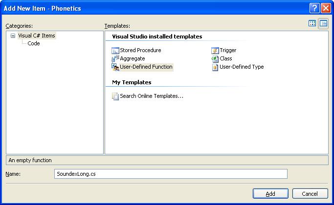 usingSystem;usingSystem.Data;usingSystem.Data.SqlClient;usingSystem.Data.SqlTypes;usingMicrosoft.SqlServer.Server;public partial classUserDefinedFunctions { [Microsoft.SqlServer.Server.SqlFunction] public static SqlString SoundexLong() {// Put your code herereturn newSqlString("Hello"); } };