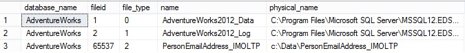 DROP TABLE ##database_filesThis returns database file info for AdventureWorks, as it is the only database on my local server with “adventure” in the name: