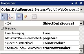 public DataTable GetProductsByPage(int pageSize, int startRowNumber) { SqlCommand cmd = new SqlCommand(); SqlParameter prPageSize = new SqlParameter("@pageSize", SqlDbType.Int, 4); cmd.Parameters.Add(prPageSize); prPageSize.Value = pageSize; SqlParameter prStartRow = new SqlParameter("@startRowNumber", SqlDbType.Int, 4); cmd.Parameters.Add(prStartRow); prStartRow.Value = startRowNumber; cn.Open(); cmd.CommandText = "sp_GetProductsByPage"; cmd.CommandType = CommandType.StoredProcedure; cmd.Connection = cn; DataTable dt = new DataTable(); dt.Load(cmd.ExecuteReader(CommandBehavior.CloseConnection)); return dt; } public int CountProduct() { SqlCommand cmd = new SqlCommand(); cn.Open(); cmd.CommandText = "SELECT COUNT(ProductID) FROM Products"; cmd.CommandType = CommandType.Text; cmd.Connection = cn; return (int)cmd.ExecuteScalar(); }The GetProductsByPage function executes sp_GetProductsByPage stored procedure and returns result sets for every page. The CountProduct function is needed by ObjectDataSource for calculating input integer for startRowNumber parameter.